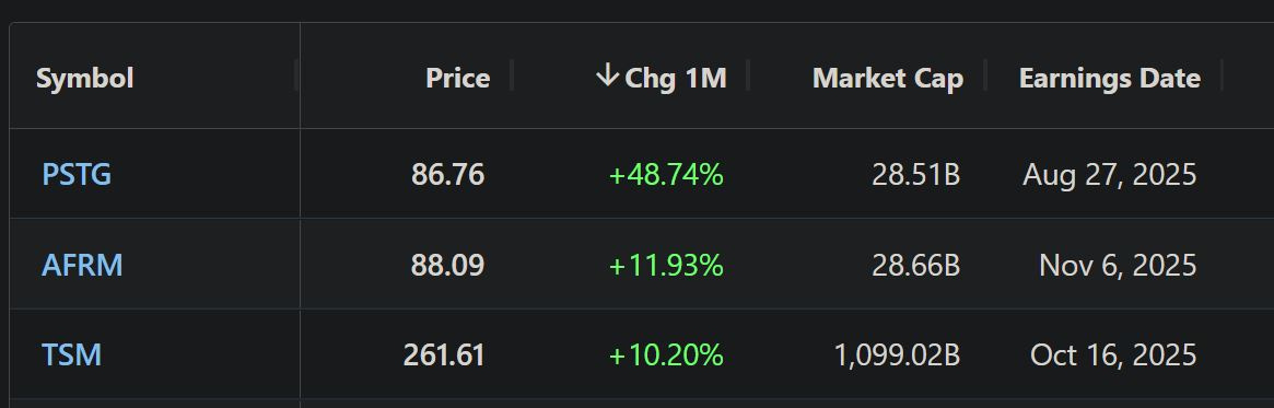 High-growth stocks in my portfolio (last 30 days): PSTG, AFRM, TSM